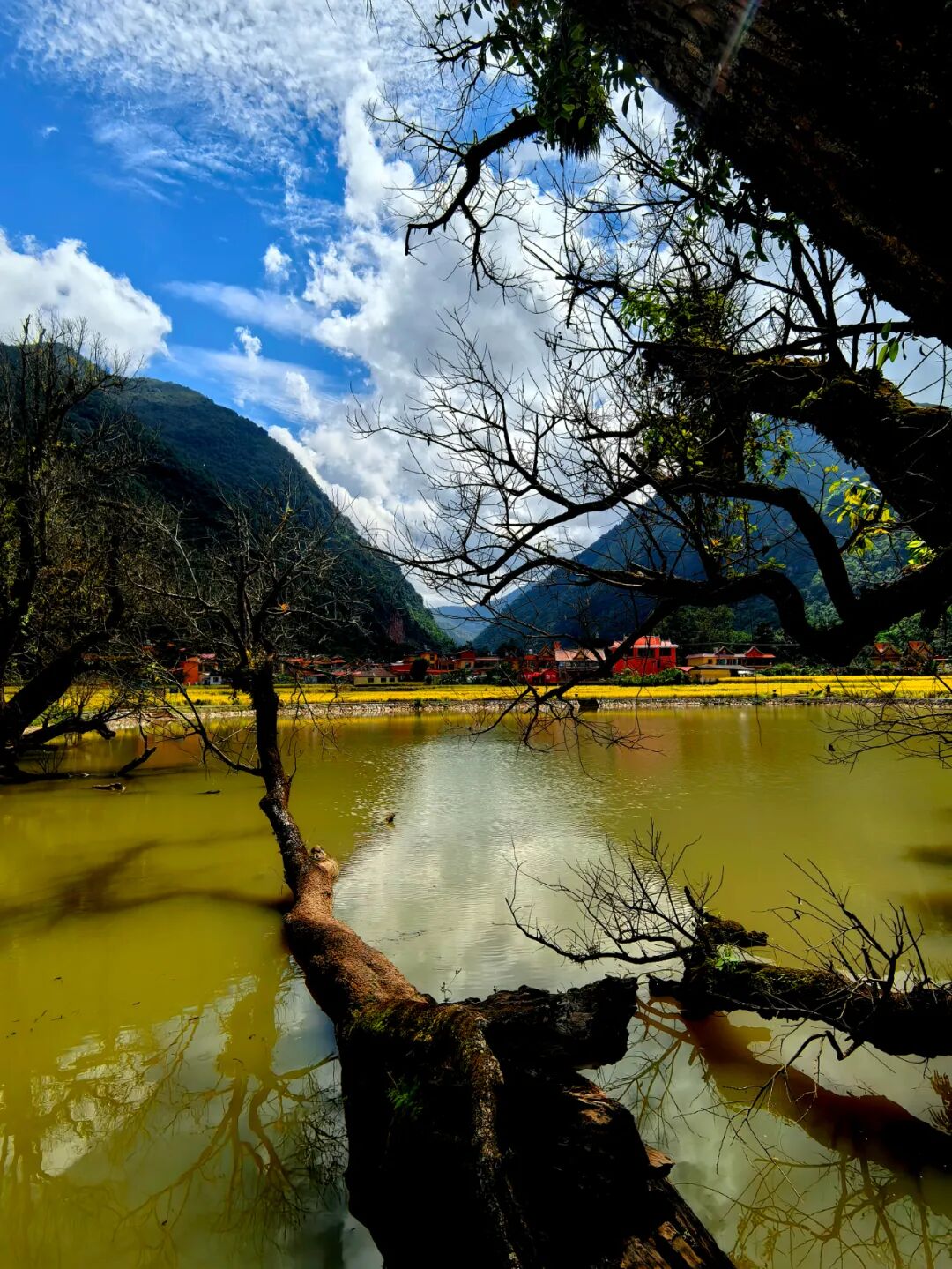镶嵌在大地上的龙女古潭,是稻田中央的重要打卡景点,几棵古老的大树环绕在古潭周边,形成天然的拍照背景。这里湖光倒影,与周围的稻田、山峦相呼应,构成美丽的山水田园画卷。稻田中间的小火车是人气爆棚的体验项目,游客可乘坐小火车穿梭在金色的稻浪中,伸手就能碰到垂下来的稻穗,感受秋天的薰风和稻花香气。乘坐着复古马车穿行于田野之间,闻着淡淡的香茅草味,车轮哒哒地滚过蜿蜒曲折的小路,使前来体验乡村生活的情侣们,别有一番浪漫风情。