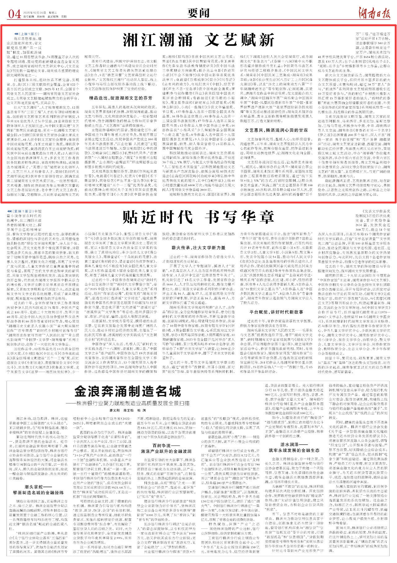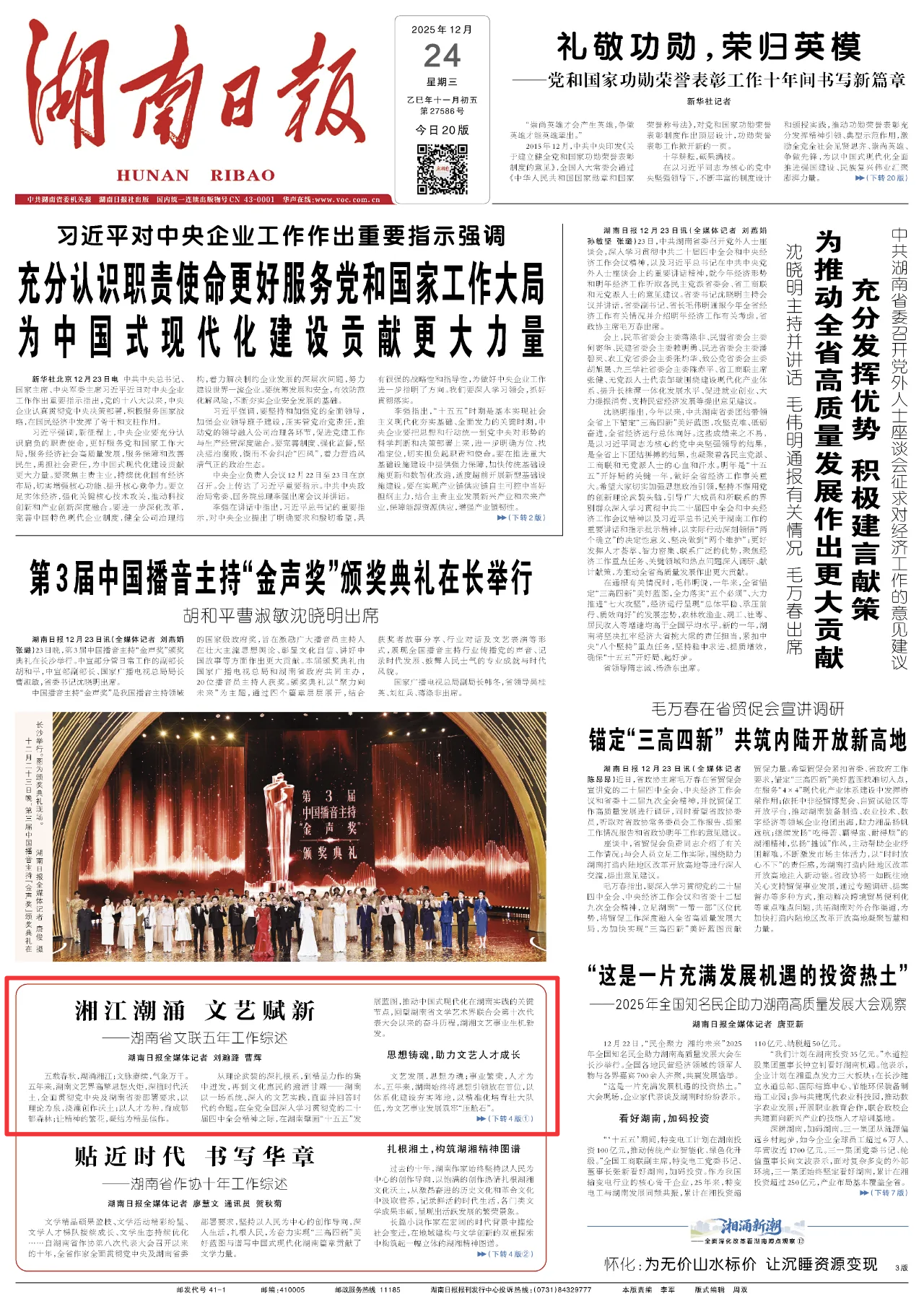 潮起潇湘风正劲,艺苑扬帆再启航。站在新的历史起点,湖南文艺界将继续坚守初心、勇担使命,以思想之光照亮创作之路,以精品之力彰显时代风华,以惠民之举温暖万家心田。